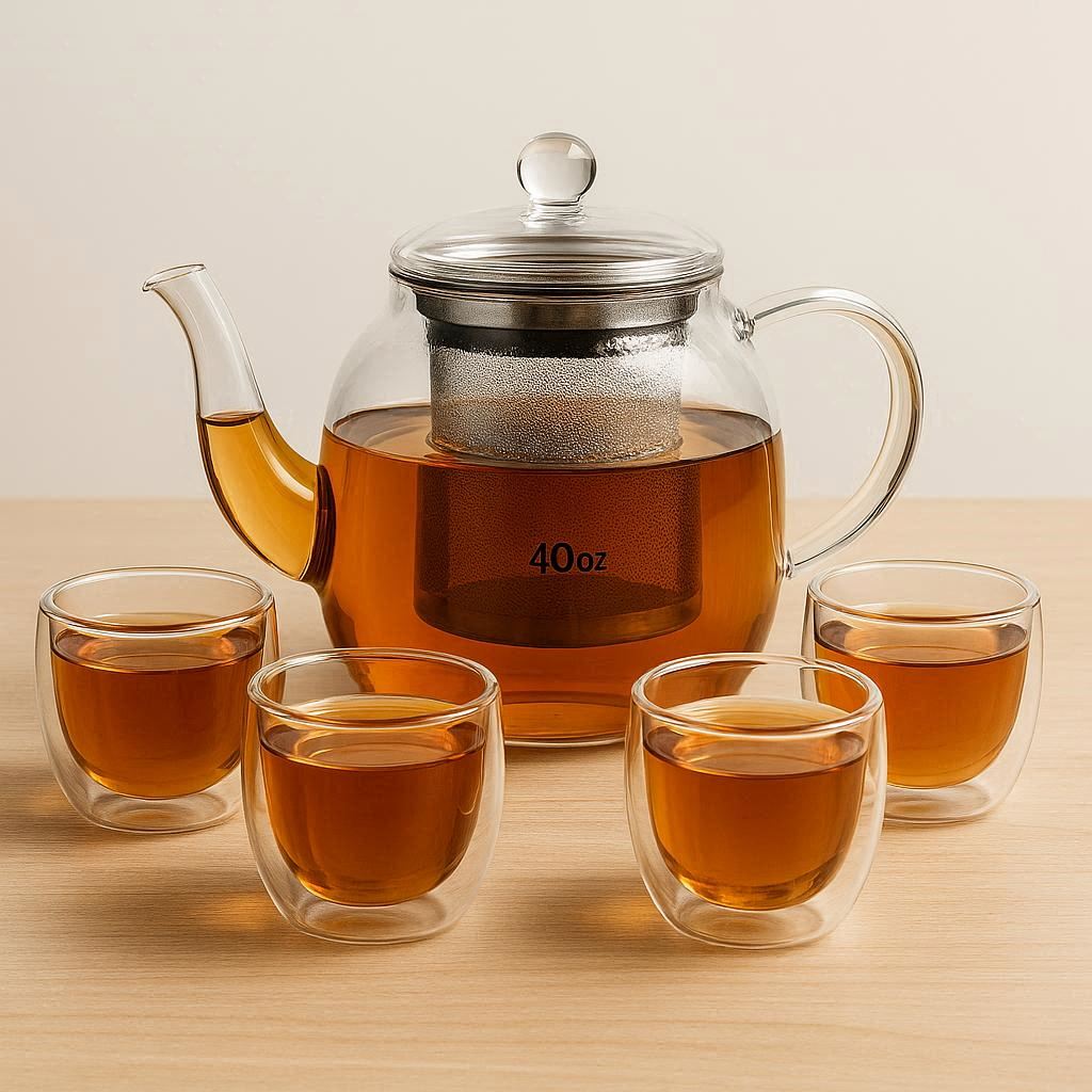 40oz Glass Teapot Set – with 4 Insulated Teacups, Perfect for Home & Office Use